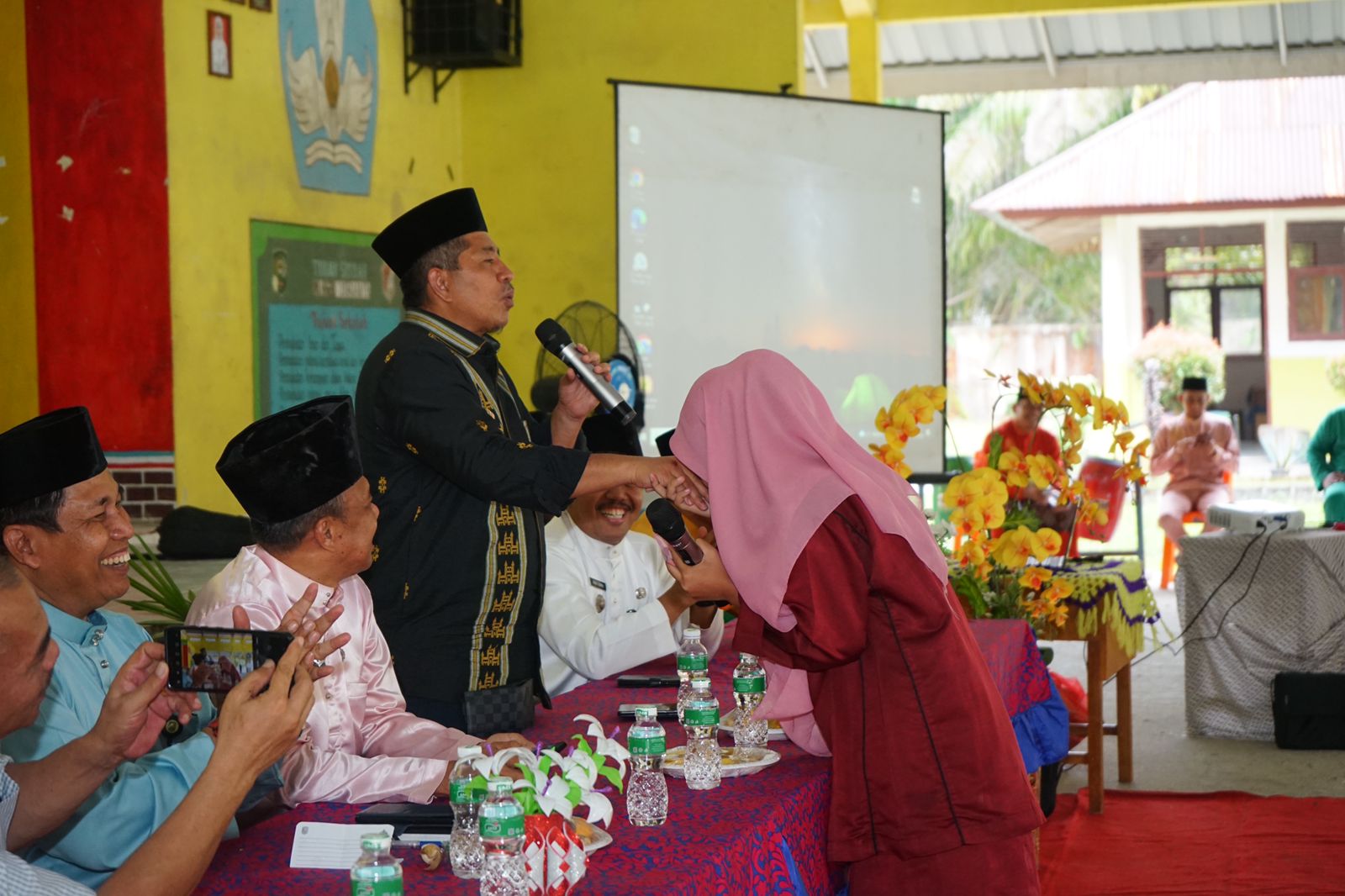 Melalui kesempatan itu Alfedri ajukan pertanyaan kepada siswa/i, “Apakah ada yang bisa menjawab pertanyaan saya, coba sebutkan Pancasila, maka seorang siswa bernama Dina menjawab, 1. Ketuhanan Yang Maha Esa, 2. Kemanusiaan yang adil dan beradab, 3. Persatuan Indonesia, 4. Kerakyatan yang dipimpin oleh hikmat kebijaksanaan dalam Permusyawaratan/perwakilan, 5. Keadilan sosial bagi seluruh rakyat”, bagus, sempurna dan Bupati Alfedri pun beri hadiah lansung kepada Dina sembari tersenyum lebar dan disambut oleh riuhnya para pelajar yang ingin menjawab pertanyaan Bupati Siak Alfedri.***