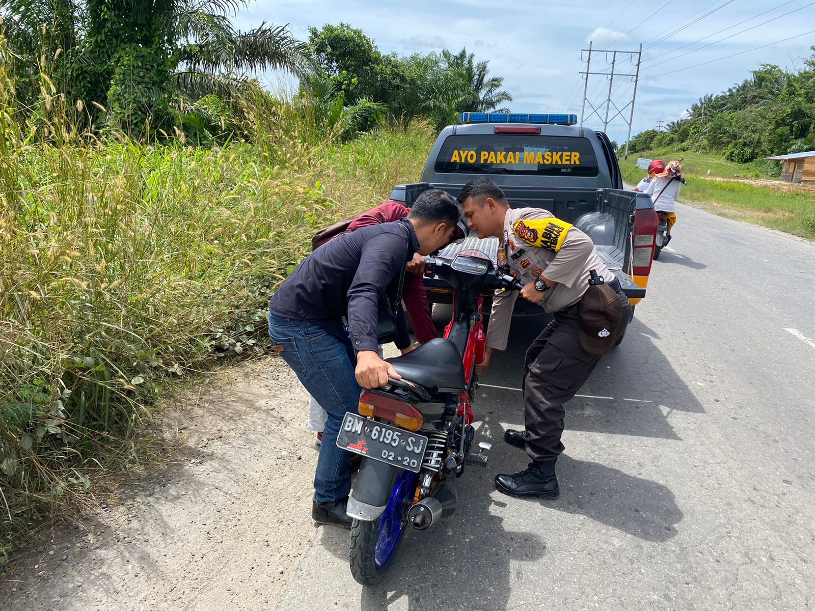 Saat dikonfirmasi Bripka Tubagus, SH mengatakan pada saat itu dirinya sedang melaksanakan tugas patroli, tanpa sengaja melihat seorang pengendara sedang mendorong sepeda motornya dengan kondisi jalan lagi sepi jauh dri pemukiman warga dan cuaca pada saat itu panas.