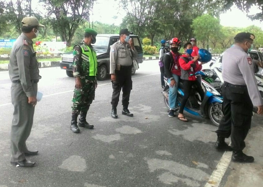 SIAK – Untuk mencegah penyebaran covid-19 di wilayah Kabupaten Siak, anggota Koramil 03/Siak bersama Polsek Siak dan Satpol PP Kabupaten Siak melaksanakan razia kepada Pengguna Jalan yang melintas dan tidak menggunakan masker dijalan Hangtuah Simpang empat Bundaran Kwalian Kelurahan Kampung Rempak Kecamatan Siak Kabupaten Siak. Jum’at (23/10/2020).