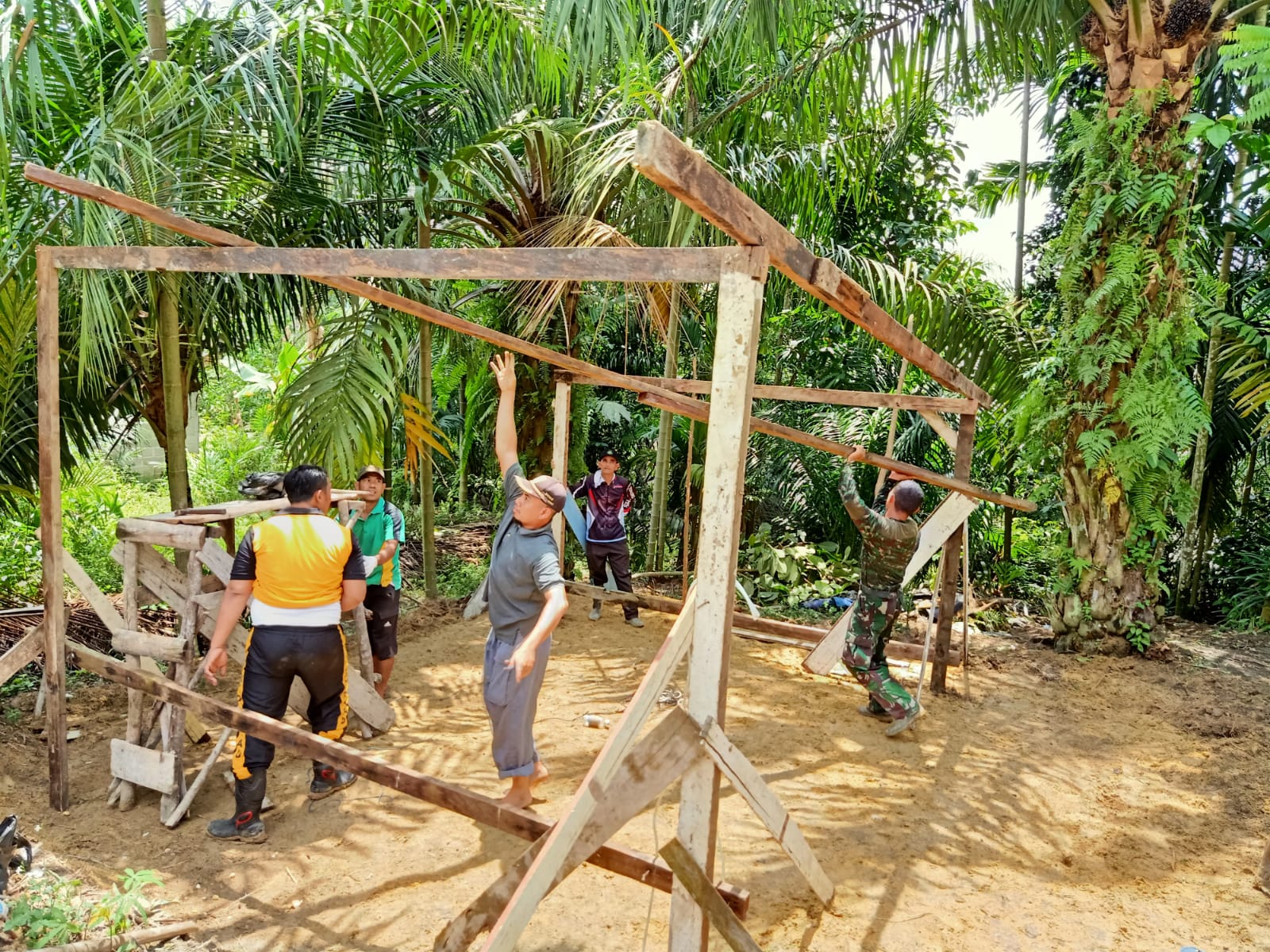 SIAK- Bhabinkamtibmas Polsek Tualang Kampung Pinang Sebatang Barat BRIPKA JUMI P. SIHOMBING didampingi Pjs.Penghulu Kamping Pinang Sebatang Barat HERMAN.S.Sos dan masyarakat kampung mendirikan rumah bapak AMANI yang tidak layak huni.