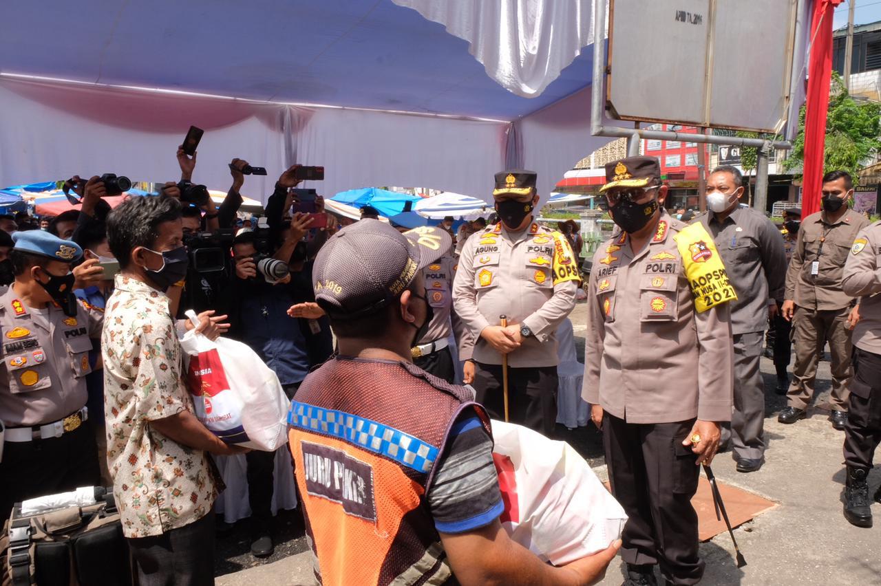 Di Posko pasar Cik Puan Komjen Arief sempat berdiskusi dengan warga dan pedagang yang dilihatnya cukup tertib dalam menjaankan protokol kesehatan. Kabaharkam juga berkesempatan memberikan Bansos paket sembako kepada masyarakat yang terdampak Pandemi covid-19.