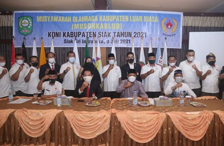SIAK- Bupati Siak Alfedri buka secara langsung Musyawarah Olahraga Kabupaten Luar Biasa (MUSORKABLUB) Koni Kabupaten Siak tahun 2021, di hotel Grand Royal, Kecamatan Siak, Sabtu (3/7/2021).