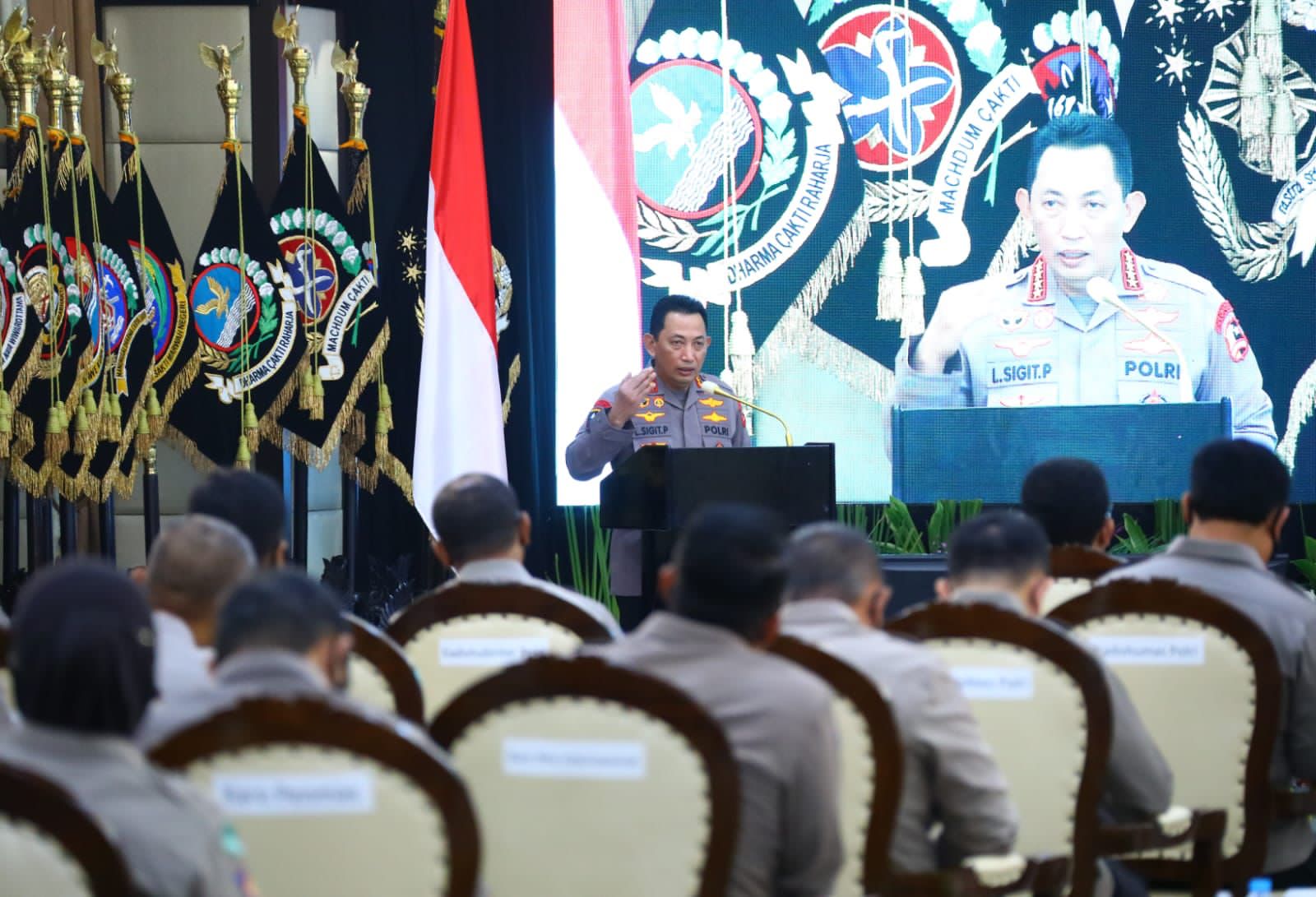 JAKARTA – Kapolri Jenderal Listyo Sigit Prabowo membuka secara resmi rapat kerja teknis (rakernis) gabungan beberapa satuan kerja (satker) di Rupatama Polri, Jakarta Selatan, Selasa (22/3/2022).