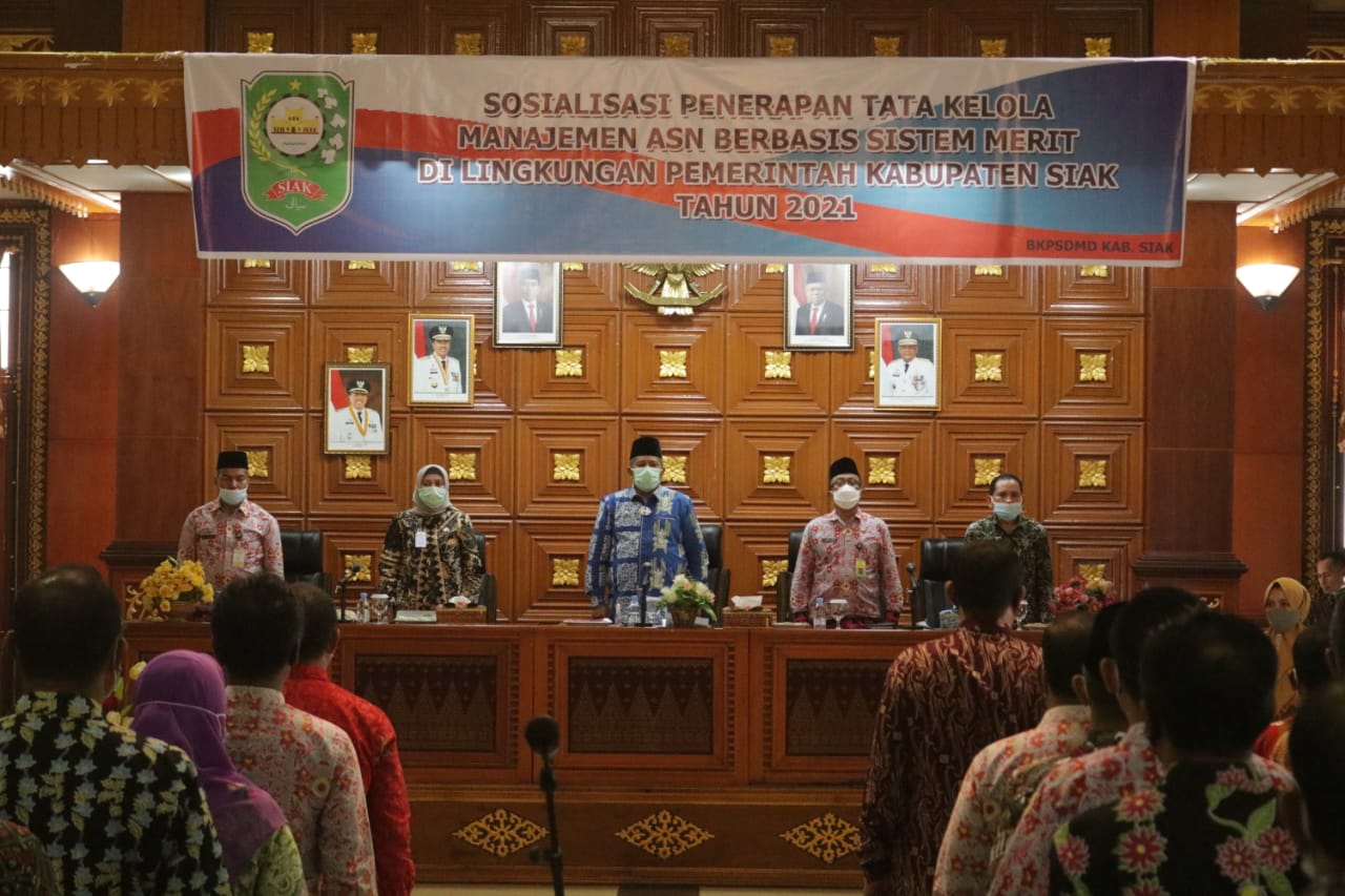 SIAK – Bupati Siak Alfedri membuka secara langsung Sosialisasi Penerapan Tata Kelola Managemen ASN Berbasis Sistem Merit dilingkungan Pemerintah Kabupaten Siak, yang dilaksanakan di Ruang Rapat Raja Indra Pahlawan, kantor Bupati Siak, Kamis Siang (18/3/2021).