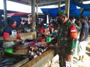 Babinsa Serda R. Panjaiatan Ingatkan Warga Jangan Abaikan Protokol Kesehatan Di Pasar.