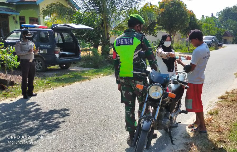 Lubuk Dalam – Untuk mencegah penyebaran covid -19 di wilayah binaan Babinsa Kampung Rawang Kao Koramil 03/Siak Serda S. Nasution bersama Bhabinkamtibmas dan aparatur Kampung melakukan Himbauan Penerapan Protokol Kesehatan serta pembagian masker kepada warga yang melintasi jalan didepan Kantor Penghulu Rawang Kao Kecamatan Lubuk Dalam Kabupaten Siak,Selasa (14/09/2021).