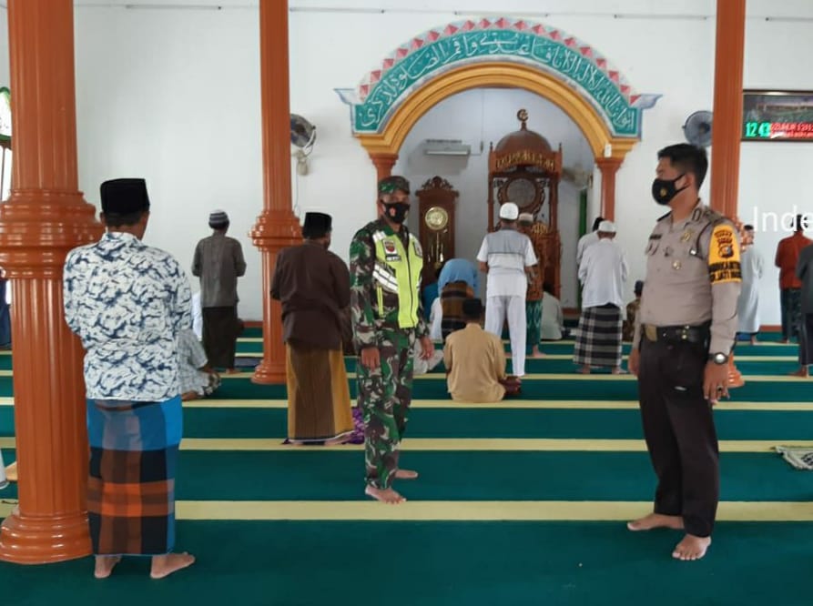 Selain melakukan cek suhu tubuh warga, Babinsa dan Bhabinkamtibmas juga memantau pelaksanaan jaga jarak antar umat saat persiapan shalat.