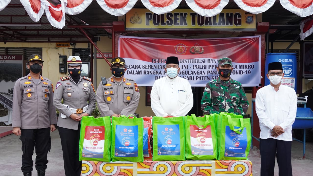 SIAK,- Bupati Siak Drs.H.Alfedri.Msi didampingi Kapolres Siak AKBP Gunar Rahadiyanto,SIK, MH melepas pendistribusian bantuan sosial berupa paket sembako di Kantor Mapolsek Tualang, Jumat (16/7/2021).
