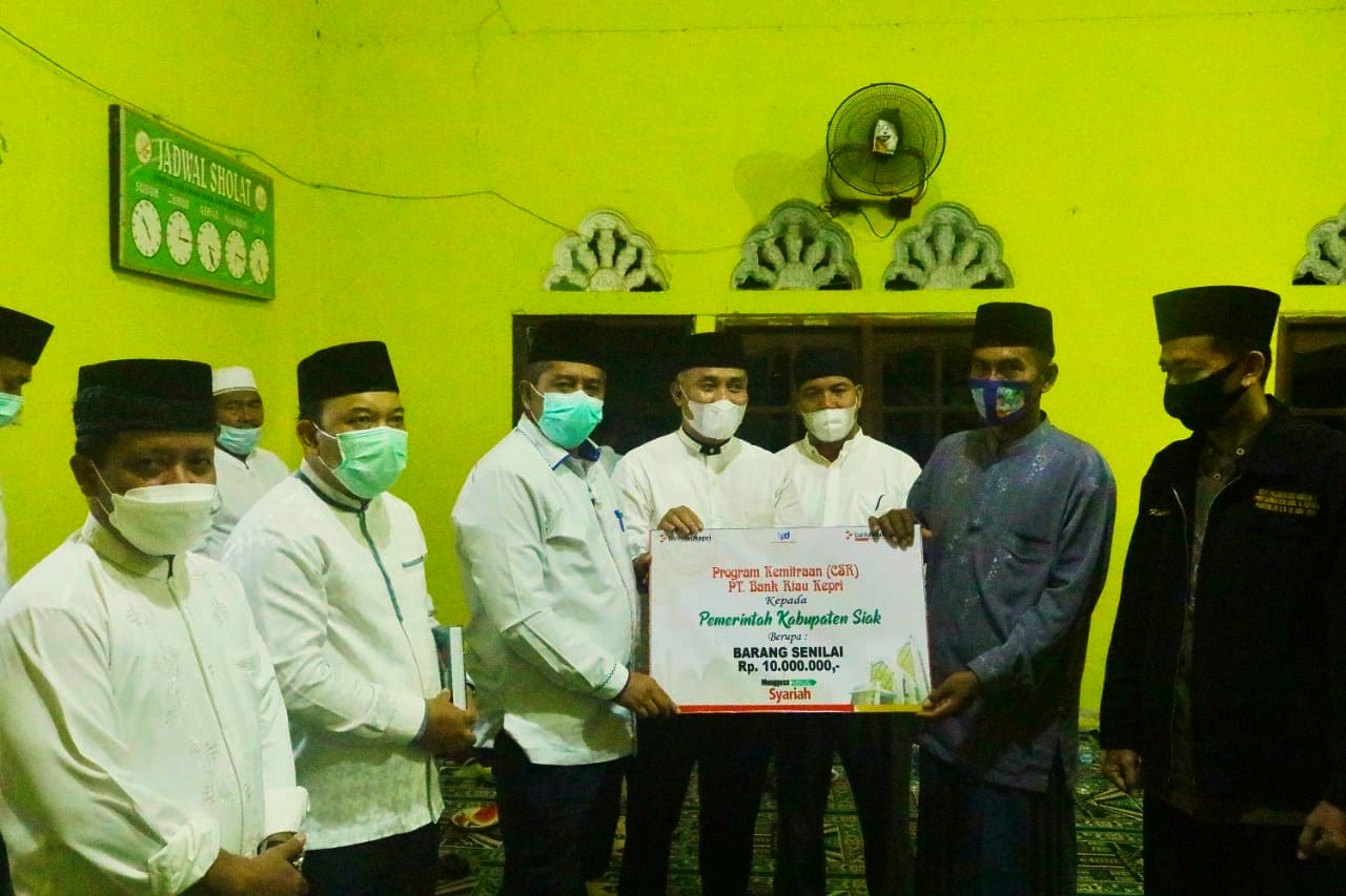 Sebelum acara dilaksanakan, terlebih dahulu dilakukannya penyerahan Bantuan Sajadah, Al Qur’an terjemahan 10 Buah kepada Masjid Baiturrahman serta penyerahan bantuan uang tunai kepada anak yatim dari CSR Bank Riau Kepri senilai 10 Juta Rupiah oleh Bupati Siak Alfedri beserta Wakil Bupati Siak Terpilih Husni Merza Secara Simbolis.(Inf)