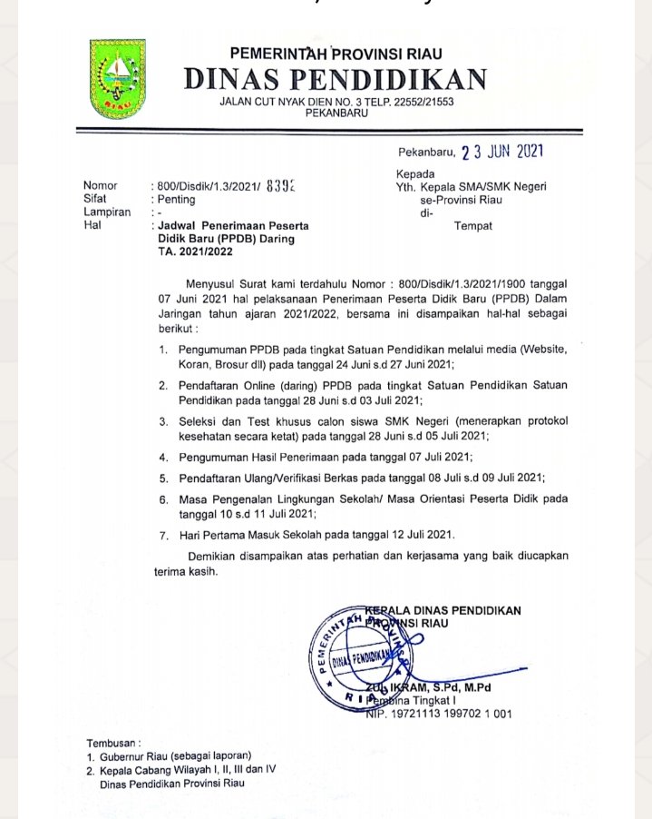 Kepala Dinas Pendidikan Riau, Zul Ikram mengatakan, informasi akan dilaksanakan nya PPDB tersebut juga sudah disampaikan kepada para kepala sekolah SMA/SMK negeri di Riau melalui surat resmi. Surat tersebut bernomor 800/Disdik/1.3/2021/8392.