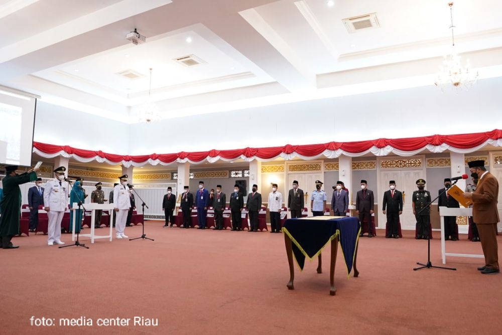 PEKANBARU – Gubernur Riau (Gubri) Syamsuar resmi mengambil sumpah jabatan dan melantik Kamsol sebagai Penjabat (Pj) Bupati Kampar dan Muflihun sebagai Pj Wali Kota Pekanbaru, di Gedung Daerah Balai Pauh Janggi, Senin (23/5/2022).