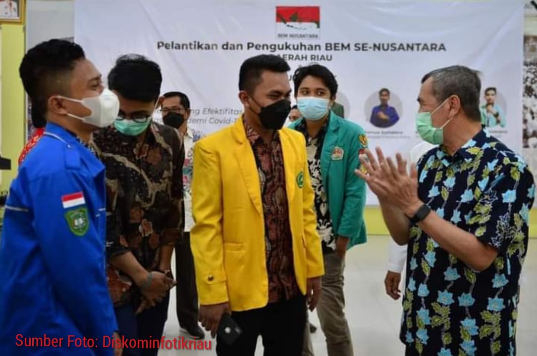 PEKANBARU- Gubernur Riau Drs H Syamsuar MSi  menghadiri acara pelantikan dan pengukuhan kepengurusan Koordinator Daerah (Korda) Riau Badan Eksekutif Mahasiswa (BEM) Nusantara periode 2021-2022 di Asrama Haji Riau, Minggu (25/4/2021).