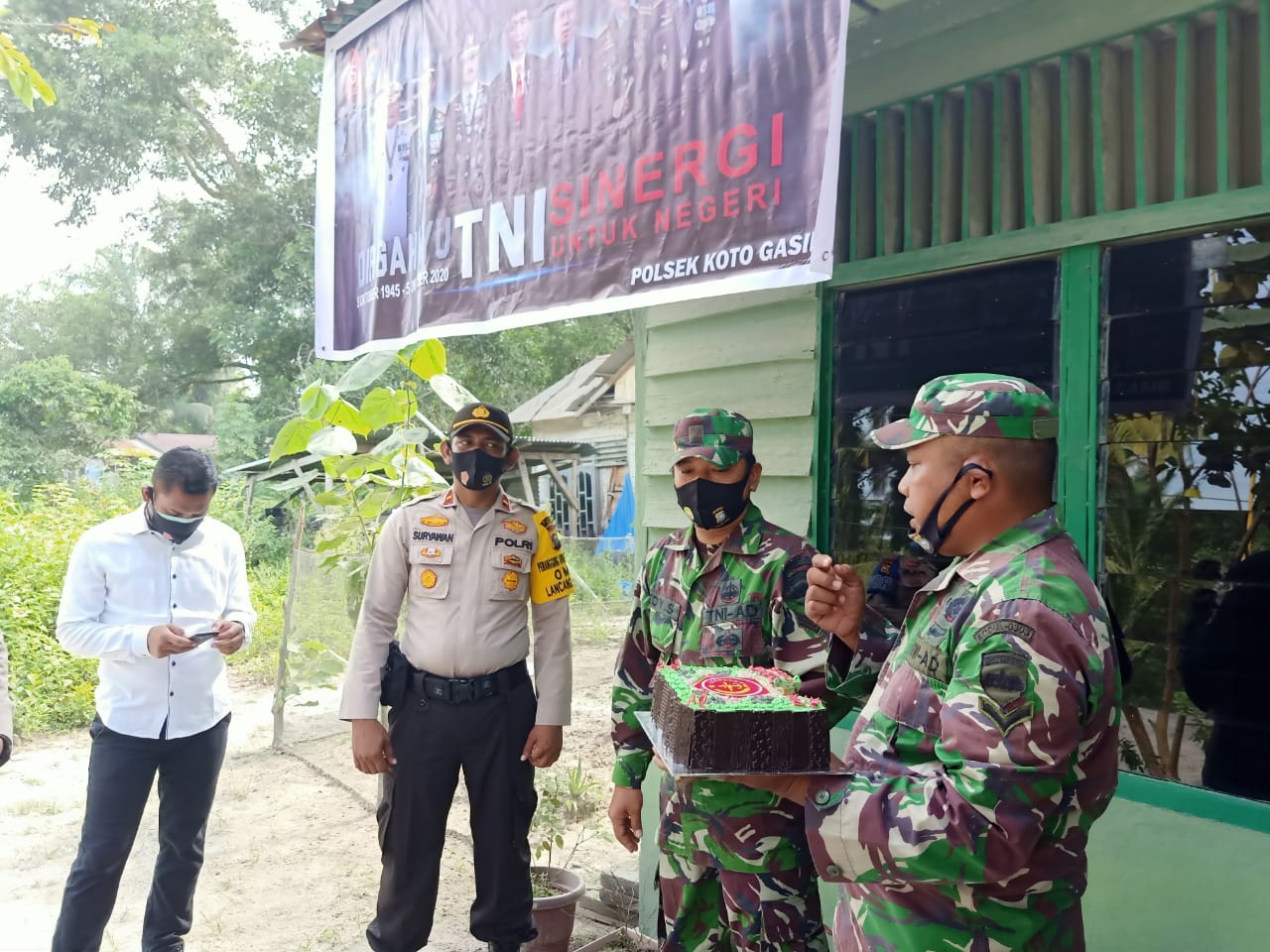 Untuk kali ini di HUT TNI ke 75 Kapolsek Koto Gasib Ipda Suryawan Fadlin bersama seluruh Bhabinkamtibmas dan sejumlah personel menyambangi Kantor Bhabinsa Koramil 10 Perawang di Kampung Pangkalan Pisang, Kecamatan Koto Gasib, sambil membawa kue ulang tahun peringatan HUT ke-75 TNI yang jatuh pada hari ini, Senin (5/10).