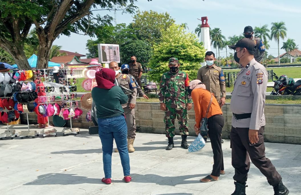 Siak Sri Indrapura – Aparat TNI, Polri dan Satpol PP dari Koramil 03/Siak bersama Polsek Siak melaksanakan kegiatan imbauan dalam penegakan disipilin protokol kesehatan Covid-19 yang dilaksanakan di Taman Mahratu Kecamatan Siak Kabupaten Siak, Minggu (10/10/2021).