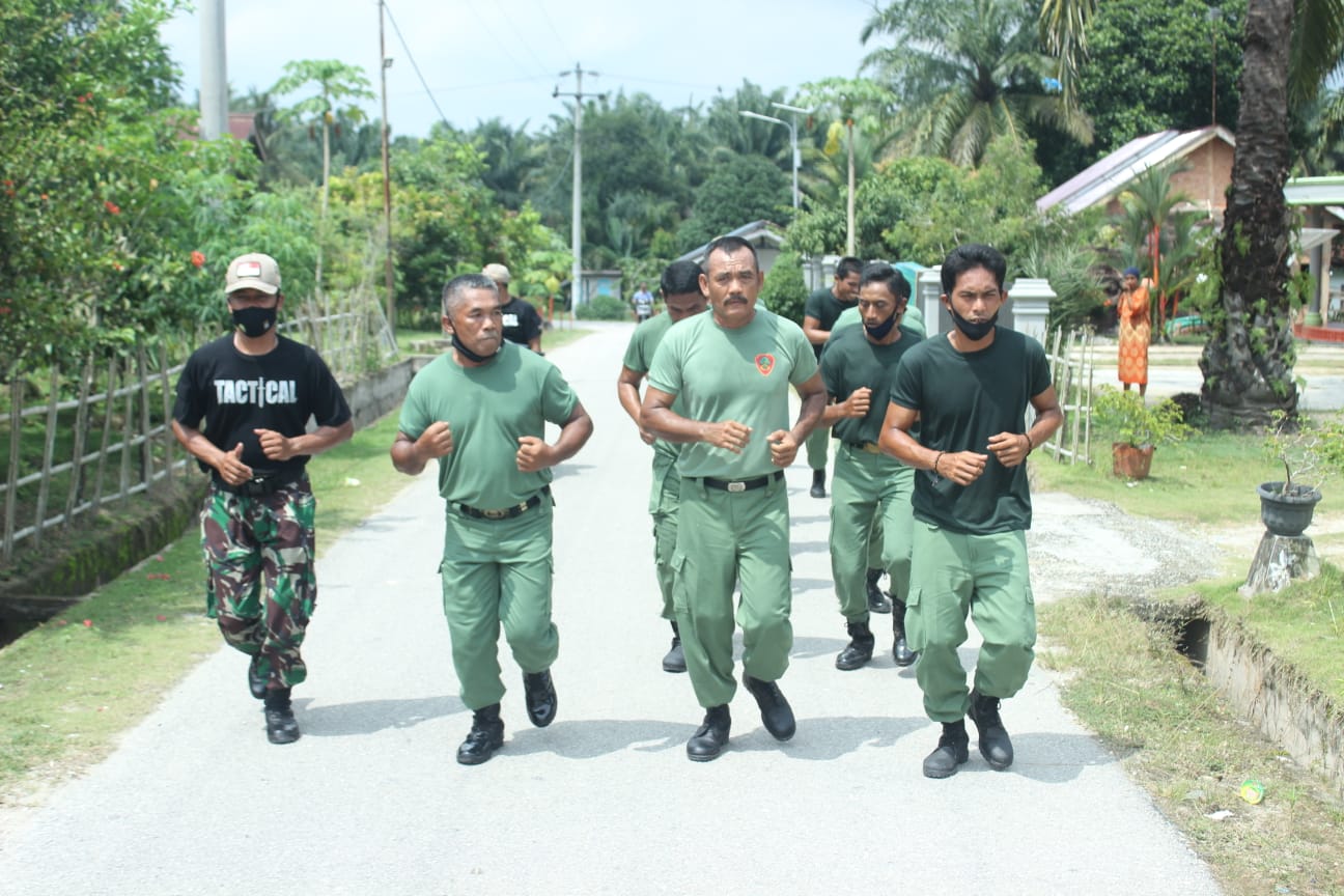 Dayun – Babinsa Pangkalan Makmur Koramil 03/Siak Kodim 0303/Bengkalis Serda Ponidi bersama sama dengan Anggota Linmas Kampung Pangkalan Makmur Kecamatan Dayun Kabupaten Siak melaksanakan latihan pembinaan fisik. Rabu, (11/11/2020)