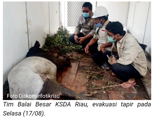 Plh. Kepala Balai Besar KSDA Riau, Hartono mengatakan Tapir berjenis kelamin jantan itu berhasil dievakuasi pada Selasa (17/08). Lantaran kondisi fisiknya yang mulai menurun, pihak perusahaan mengambil tindakan awal melalui Mantri Hewan memberikan obat antibiotik serta obat kutu dan anti lalat.