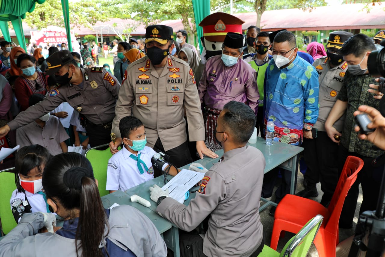 SIAK- Setelah dilantik menjadi Kapolda Riau Irjen Pol Muhammad Iqbal, S.I.K., M.M lakukan kunjungan kerja pertama ke Kabupaten Siak kecamatan Tualang untuk meninjau pelaksanaan vaksinasi untuk anak-anak usia 6-12 tahun.