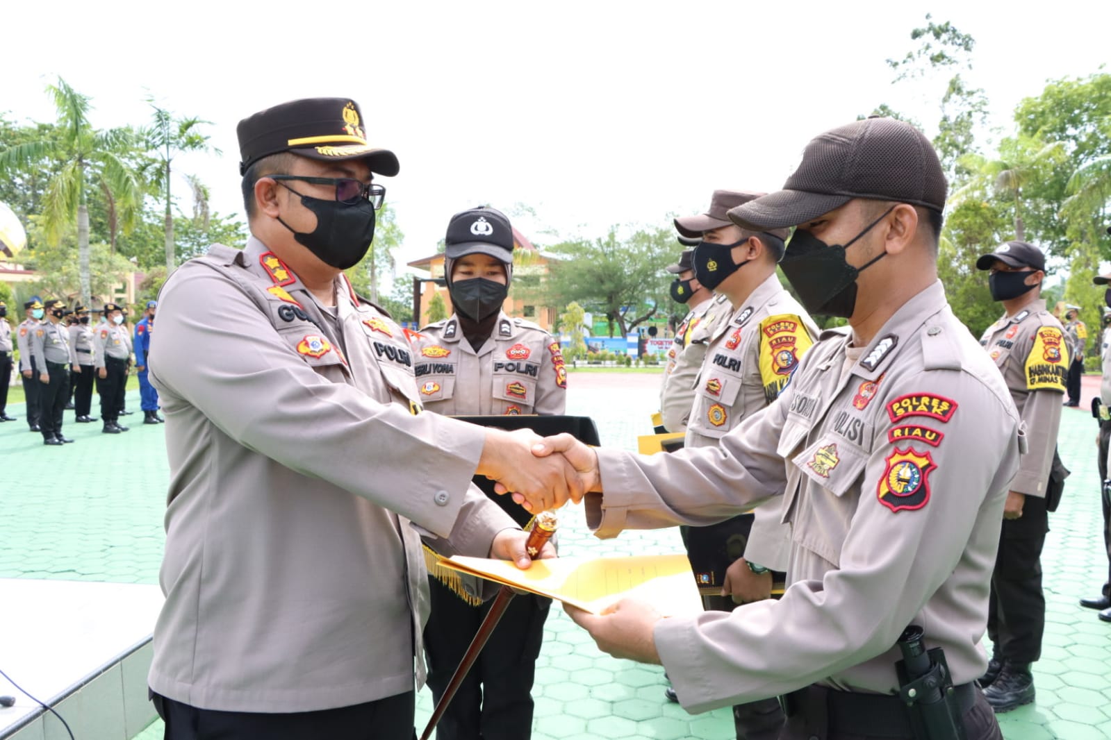 Siak,-Kapolres Siak AKBP Gunar Rahadiyanto, SIK, MH memberikan penghanggaan kepada beberapa personil Polres Siak, Sabtu pagi ( 07/05/2022 )