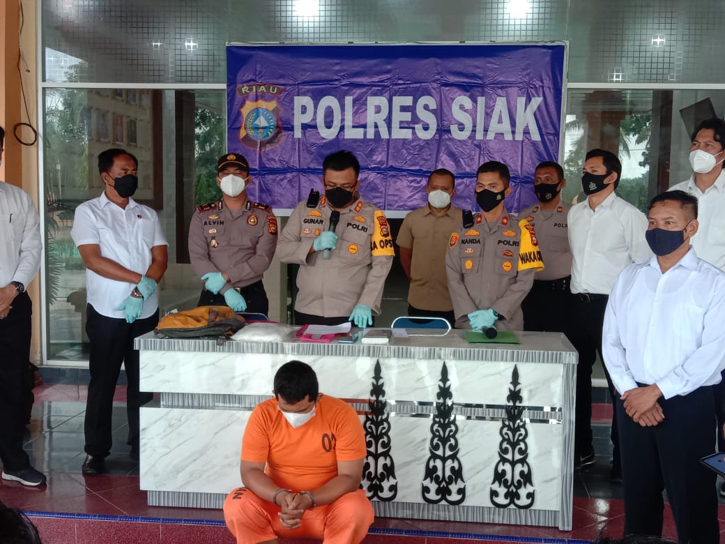 SIAK- Senin, 27 Desember 2021 Kapolres Siak AKBP GUNAR HARDIYANTO.S.I.K.MH pimpin Pres Riliase Pengungkapan Tindak Pidana Narkotika jenis sabu,-sabu di wilayah hukum Polsek Tualang, Polres Siak di Mako Polres Siak. Senin, 27/12/2021.