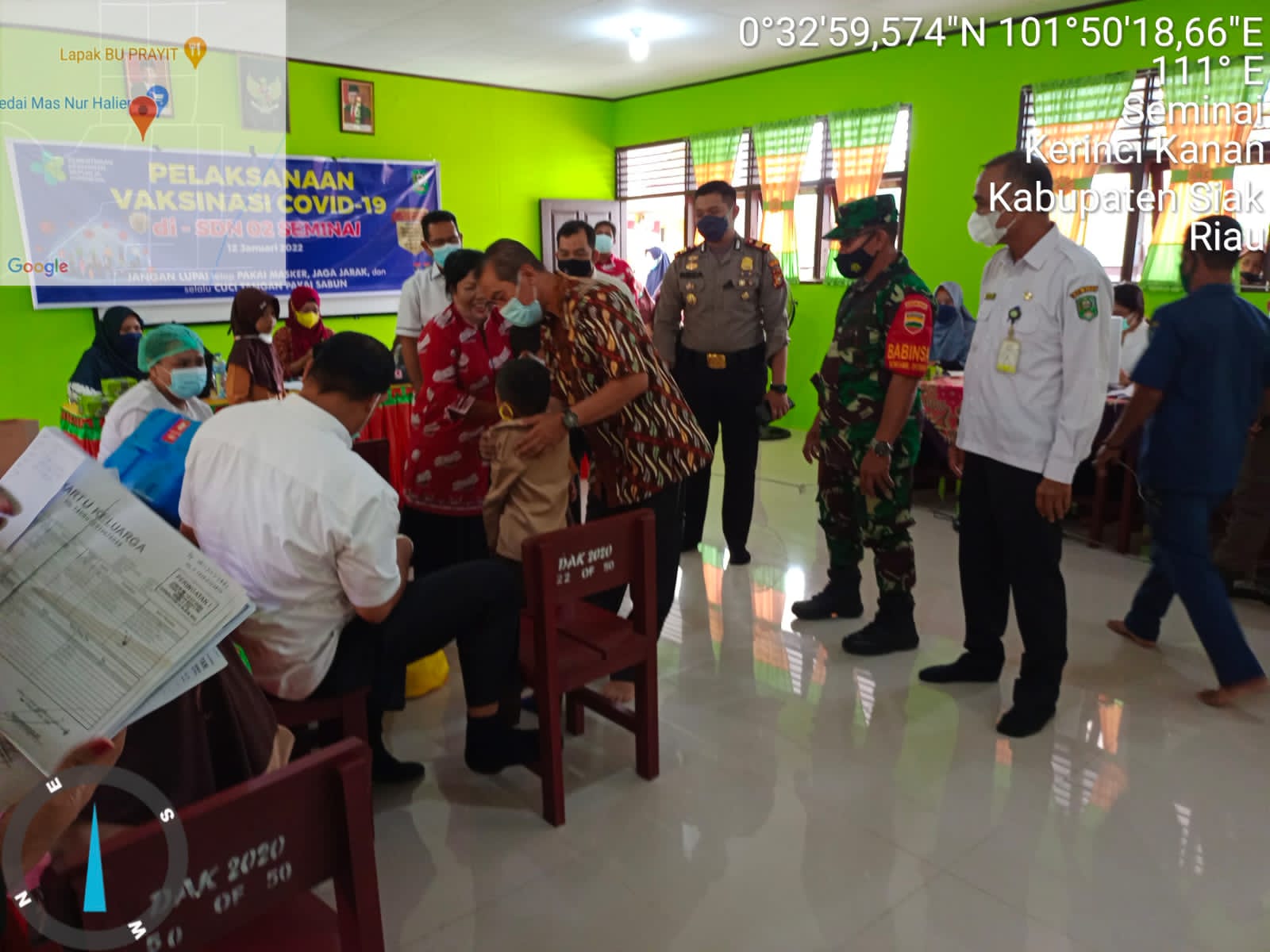 SIAK- Kapolsek Kerinci Kanan AKP Muhammad Reza S.I.K.,MH bersama camat Kerinci Kanan dan ketua UPTD Pendidikan Kecamatan Kerinci kanan serta Babinsa Koramil 01 Siak tinjau pelaksanaan vaksinasi usia 6 sampai dengan 11 tahun di SD N02 Kampung Seminai, Kecamatan Kerinci Kanan, Kabupaten Siak. Rabu, (12/1/2022).