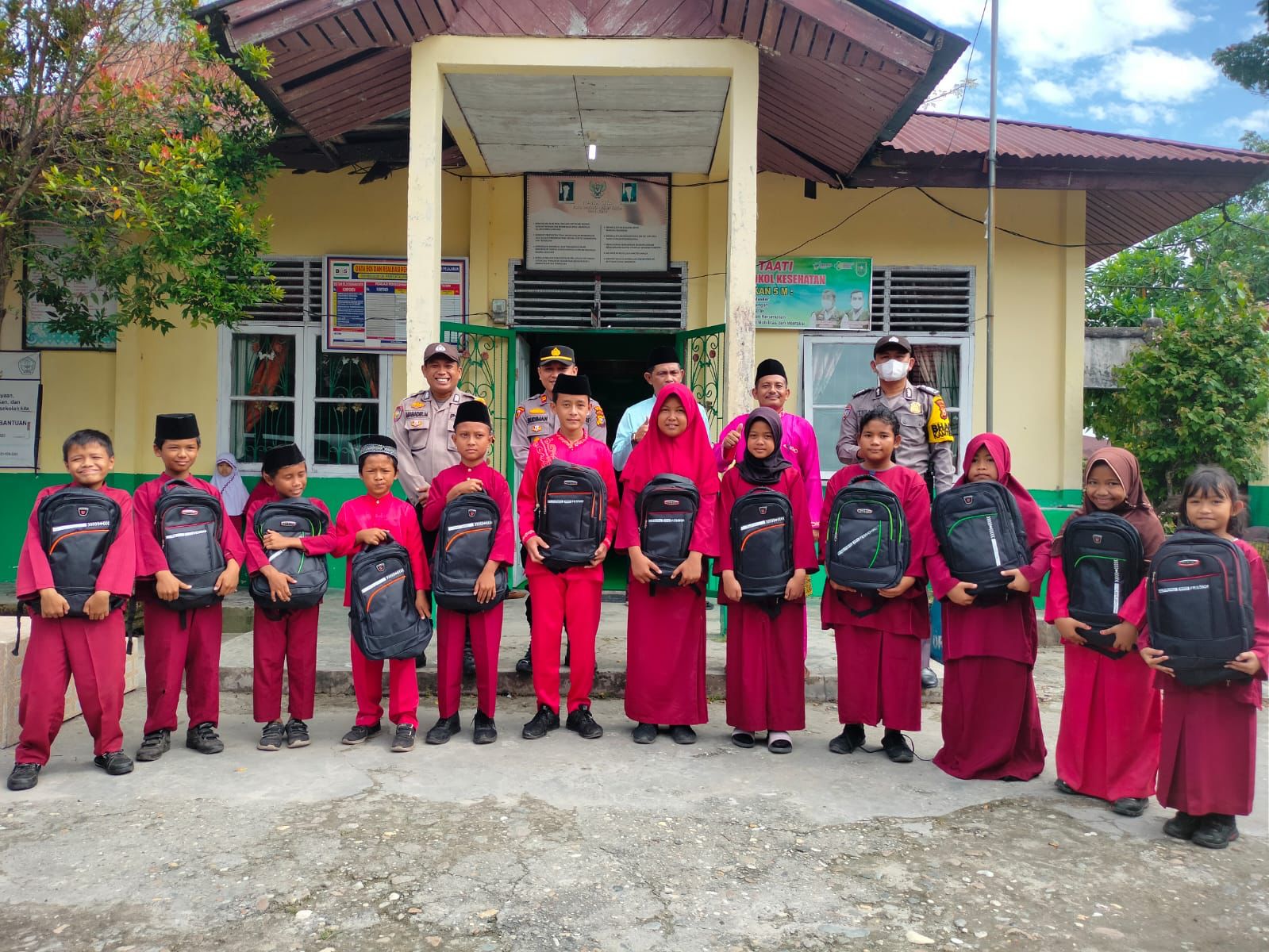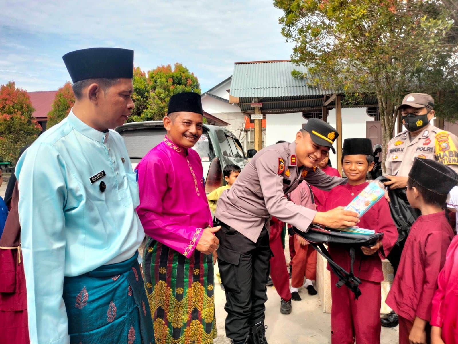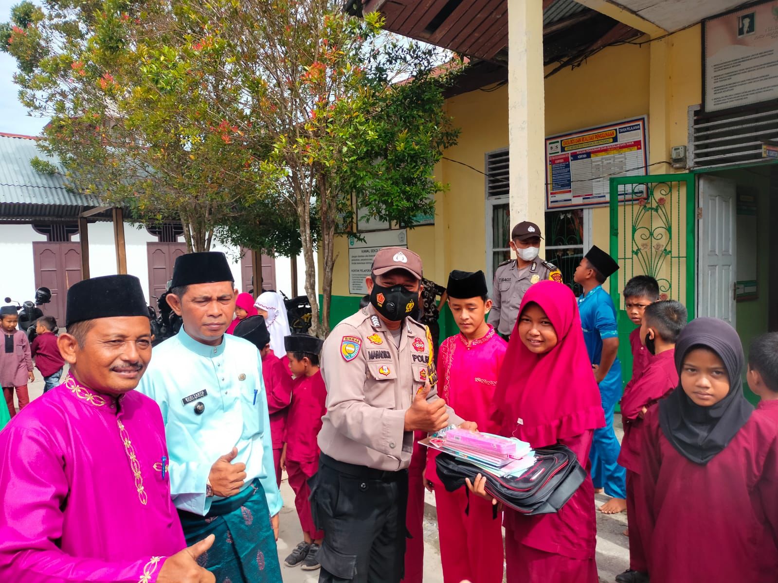 SIAK- Kapolsek Koto Gasib IPTU Budiman.S Dalimunthe, SH.MH bersama Penghulu Kampung Pangkalan Pisang Budiyanto dan Bhabinkamtibmas BRIPKA Mahadir.M melakukan kegiatan penyerahan bantuan Sosial berupa perlengkapan sekolah. Bantuan ini diberkan kepada pelajar di SD N 05 Pangkalan Pisang, Kecamatan Koto Gasib, Jum’at (18/11/2022) sekira pukul 09.30 Wib.