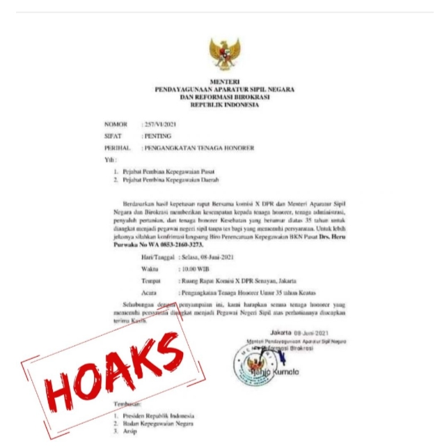 Dalam surat palsu bernomor 257/VI/2021 tentang pengangkatan tenaga honorer, seolah-olah ada keputusan rapat bersama Komisi X DPR dan Menteri Aparatur Sipil Negara dan Birokrasi untuk memberikan kesempatan kepada tenaga honorer, tenaga administrasi, penyuluh pertanian, dan tenaga honorer kesehatan yang berumur lebih dari 35 tahun untuk diangkat menjadi pegawai negeri sipil (PNS) tanpa tes bagi yang memenuhi persyaratan.