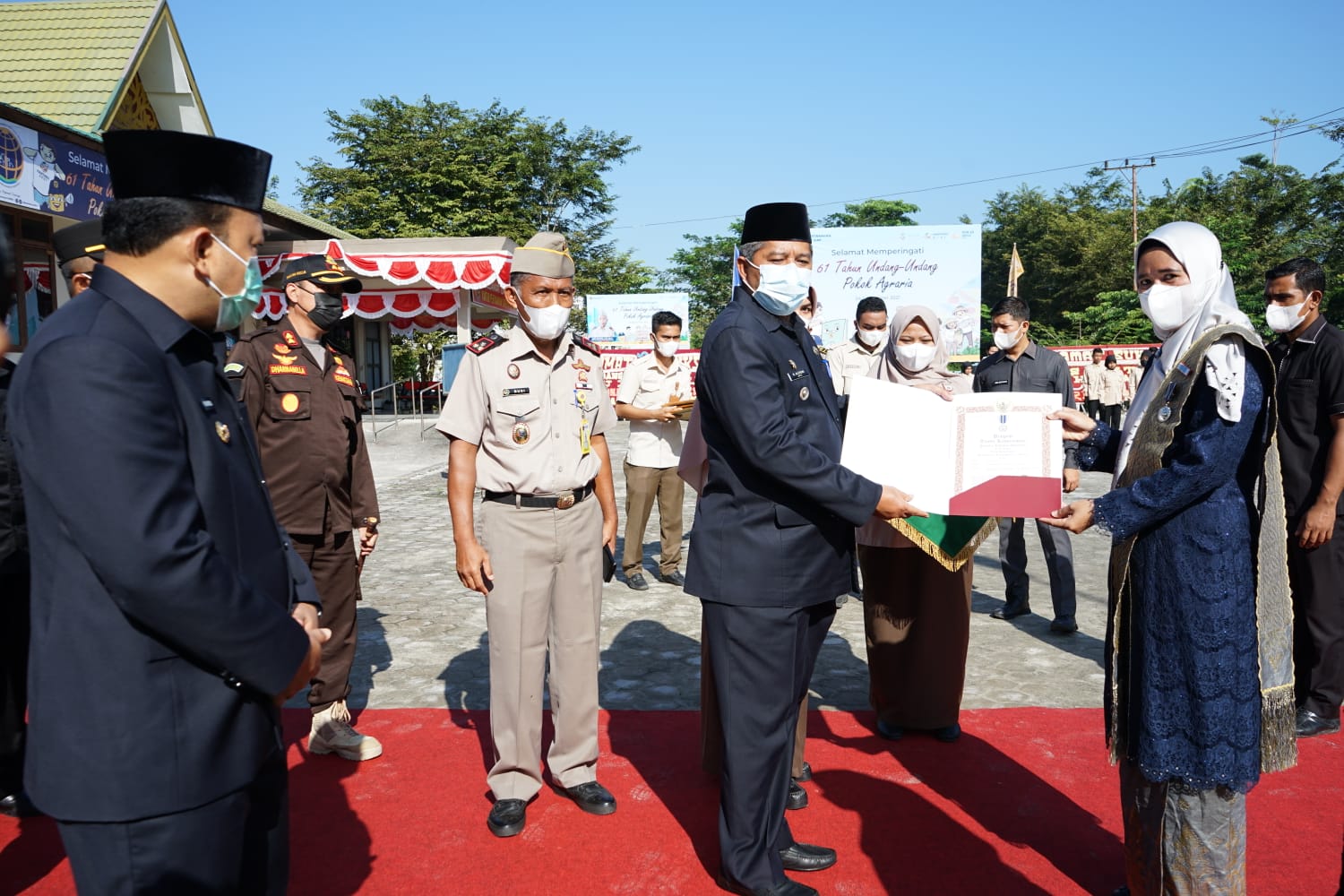 SIAK- Bupati Siak Alfedri memimpin upacara peringatan ulang tahun undang-undang pokok agraria yang ke 61 tahun, berlangsung di halaman kantor Pertanahan Kabupaten Siak, kompleks perkantoran DPRD Siak, Sungai Betung, Jumat (24/9/2021).