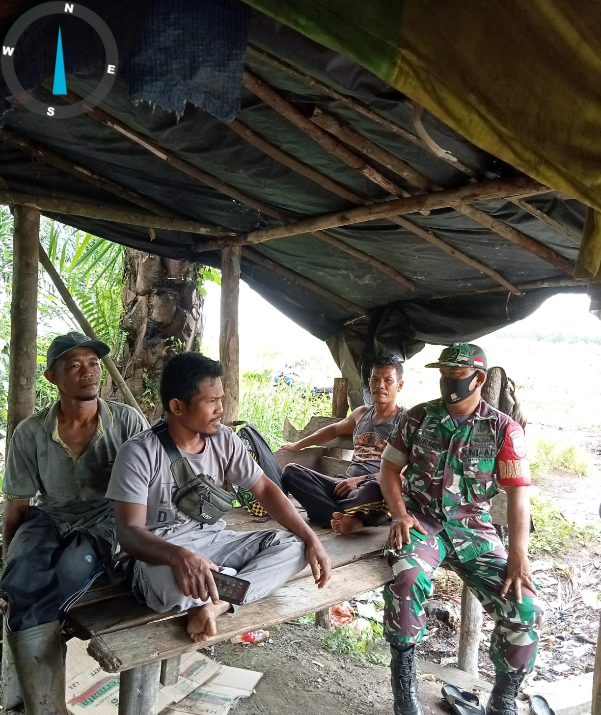 SIAK- Babinsa Koramil 01/Siak Kodim 0322/Siak mengajak warga desa binaannya tetap memakai masker, saat melaksanakan komunikasi sosial (komsos) dengan warga di Kampung Sialang Sakti, Kecamatan Dayun, Kabupaten Siak, Selasa (9/8/2022).