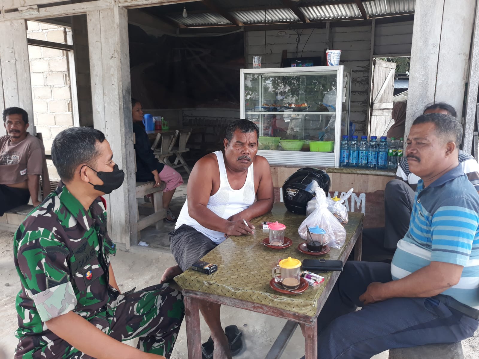 SIAK- Babinsa Koramil 01/Siak Kodim 0322/Siak mengajak warga desa binaannya tetap memakai masker, saat melaksanakan komunikasi sosial (komsos) dengan warga di Kampung Jati Mulya, Kecamatan Kerinci Kanan, Kabupaten Siak, Selasa (12/8/2022).