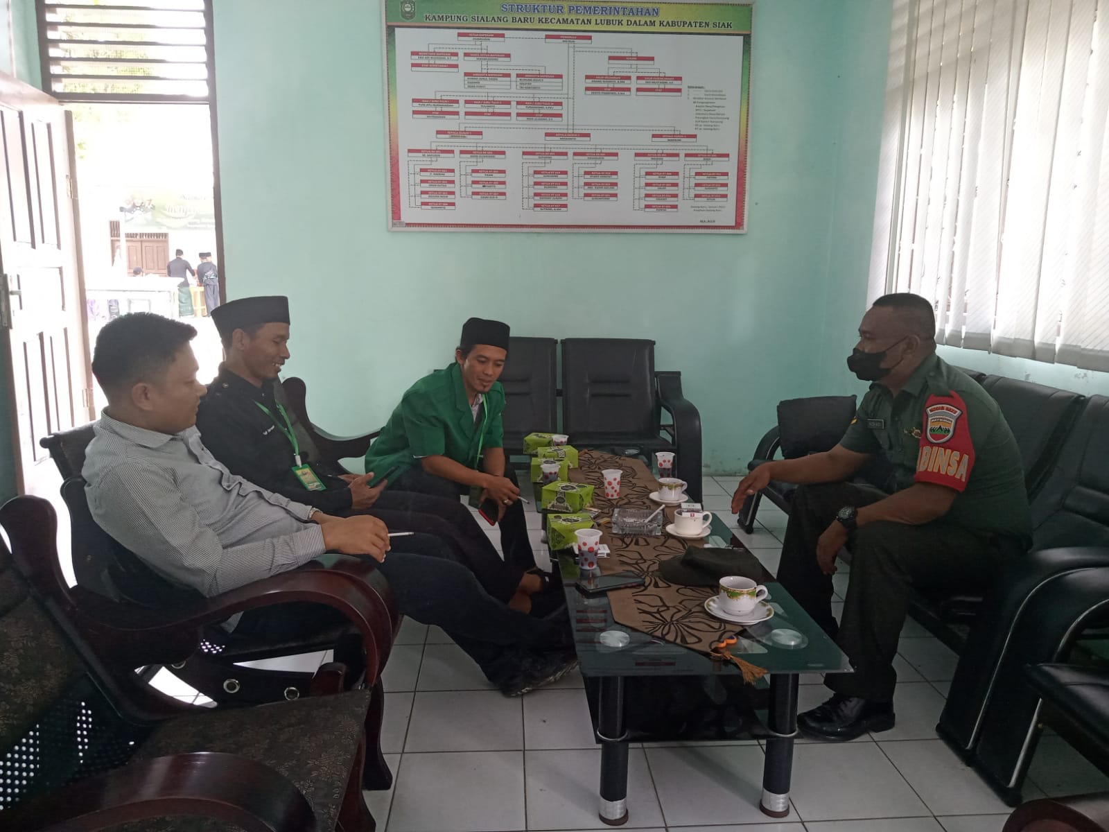 Kegiatan Komsos dilaksanakan di Kantor Kepala Kampung Sialang Baru di warung dan ditempat keramaian lainnya.**