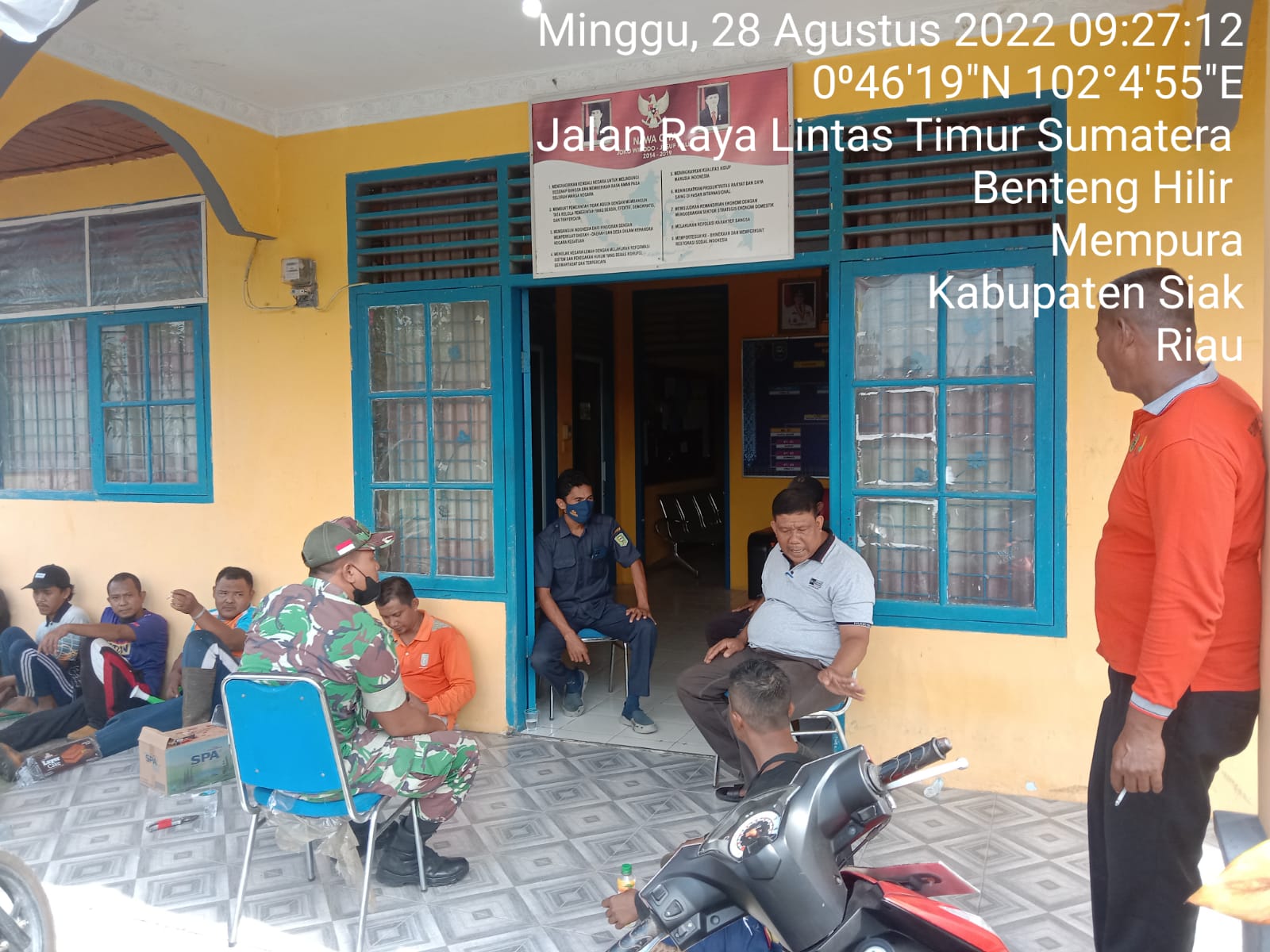 SIAK- Babinsa Koramil 01/Siak Kodim 0322/Siak mengajak warga desa binaannya tetap memakai masker, saat melaksanakan komunikasi sosial (komsos) dengan warga di Kampung Benteng Hilir, Kecamatan Mempura, Kabupaten Siak, Minggu (28/8/2022).