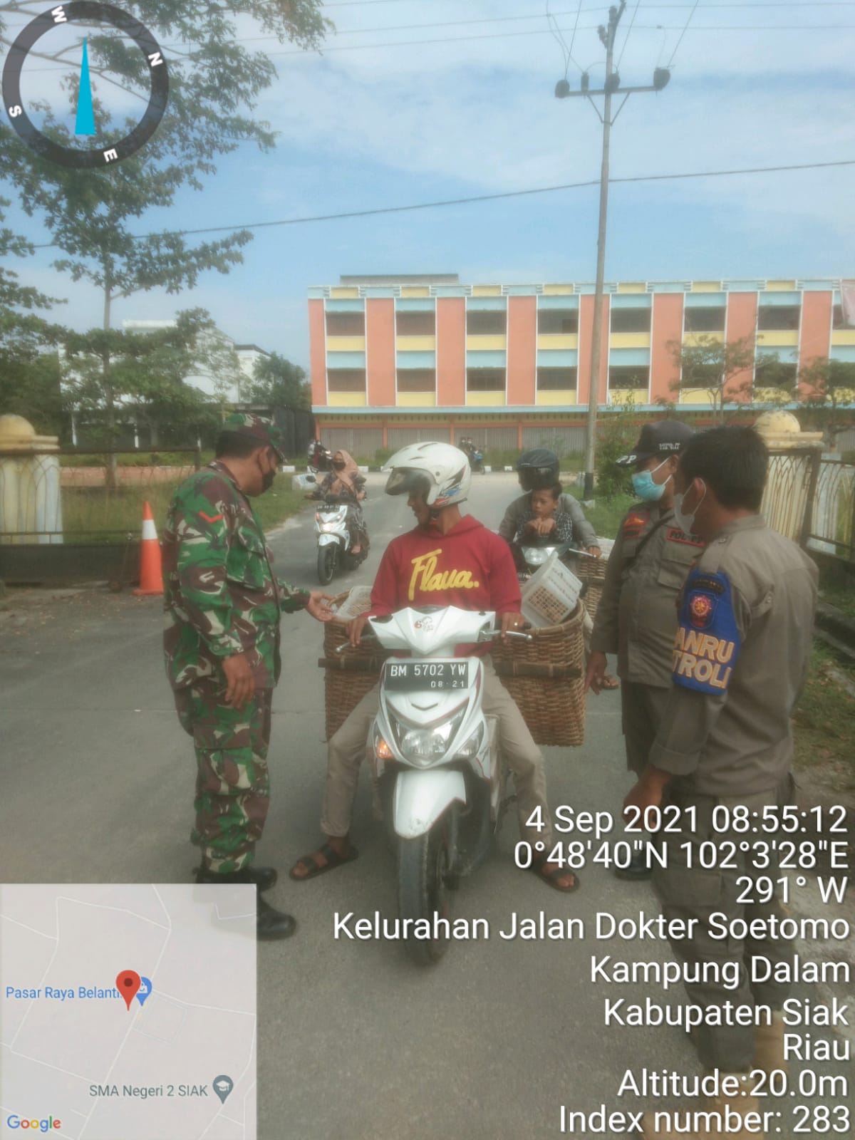 Siak Sri Indrapura – Untuk mencegah penyebran covid-19 anggota jajaran Koramil 03/Siak dalam hal ini Babinsa Kopda Ardhy anggota Satpol PP Kab. Siak melaksaksanakan pendisiplinan masyarakat terhadap protokol kesehatan dan sosialisasi tentang penanggulangan penyakit menular di pintu masuk pasar Belantik Raya Kelurahan Kampung Dalam Kecamatan Siak Kabupaten Siak, Sabtu (04/09/2021).