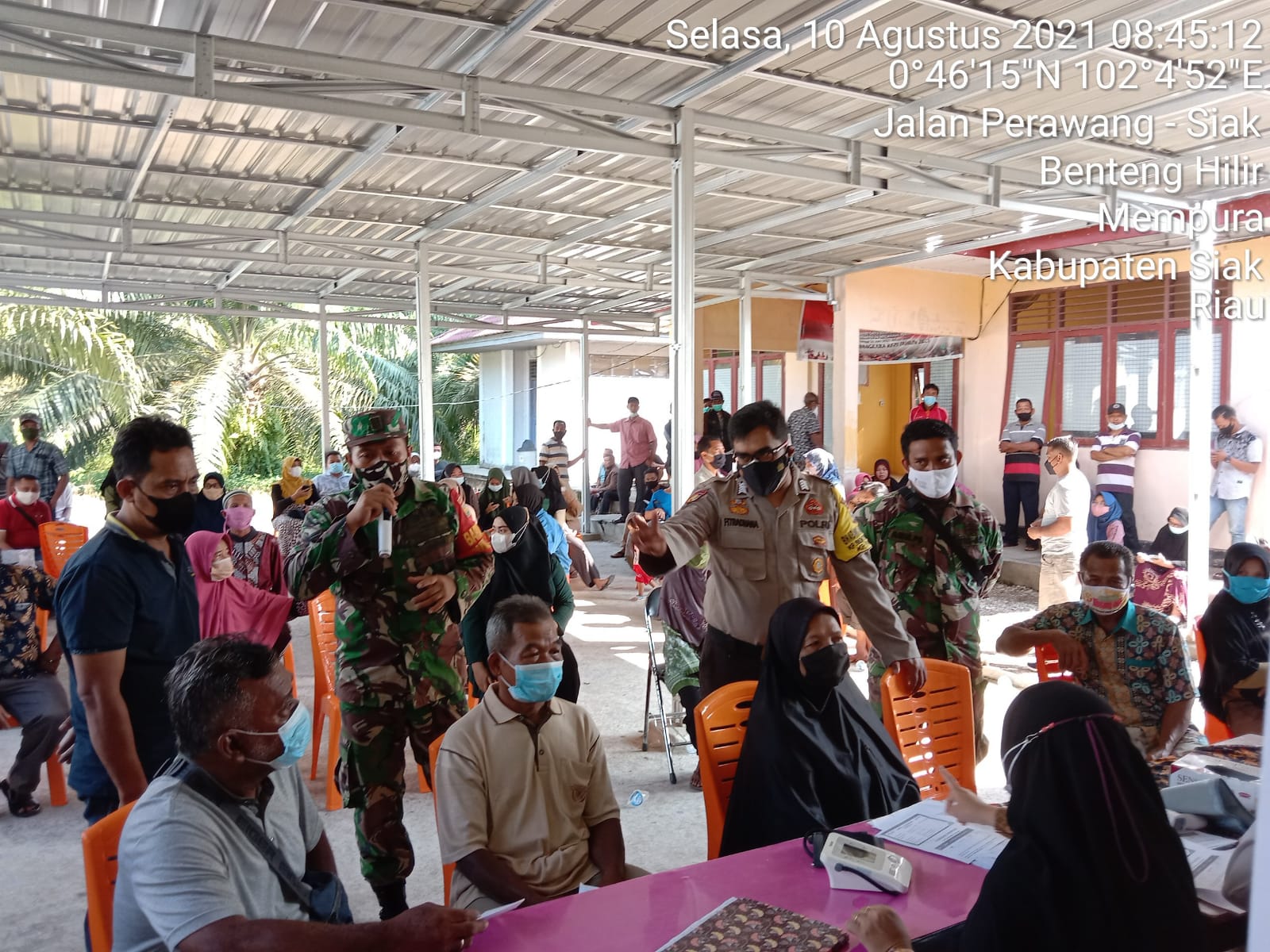 Mempura – Babinsa Koramil 03/Siak Kodim 0303/Bengkalis Serda Arianto bersama Bhabinkamtibmas melaksanakan pedampingan pelaksanan Vaksin Tahap II yang bertempat di Puskesmas Mempura Kampung Benteng Hilir Kecamatan Mempura Kabupaten Siak, Selasa (10/08/2021).