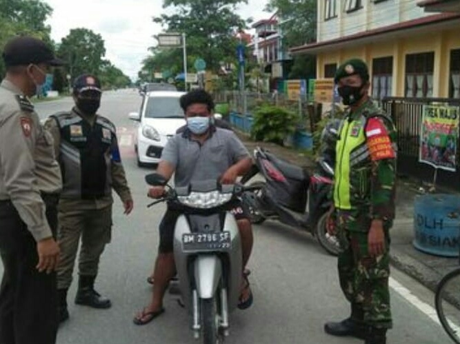 Siak Sri Indrapura – Babinsa Koramil 03/Siak Kodim 0303/Bengkalis Serka Joni bersama Polsek Siak dan Satpol PP Kabupaten Siak terusa melaksanakan operasi yustisi penegakan protokol kesehatan. Kegiatan ini berlangsung di Jalan, DR. Sutomo Kelurahan Kampung Dalam, Kecamatan Siak Kabupaten Siak, Senin (23/11/2020).