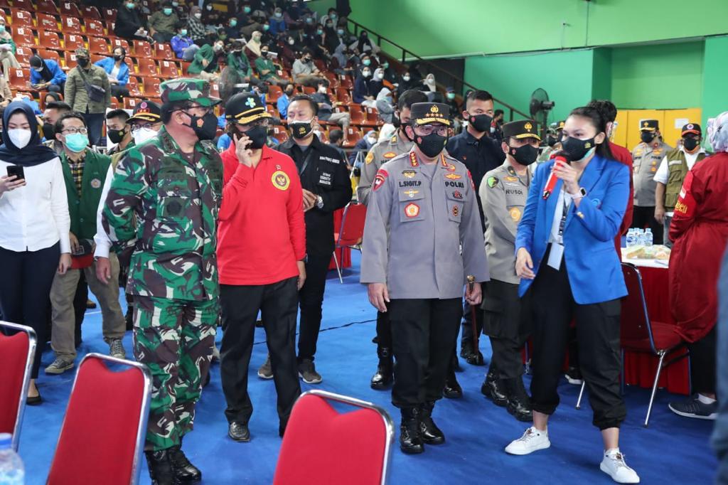 JAKARTA – Panglima TNI Marsekal Hadi Tjahjanto, Kapolri Jenderal Listyo Sigit Prabowo dan Menteri Kesehatan (Menkes) Budi Gunadi Sadikin meninjau langsung vaksinasi massal yang diselenggarakan oleh elemen mahasiswa di GOR Bulungan, Jakarta Selatan, Rabu (14/7/2021).