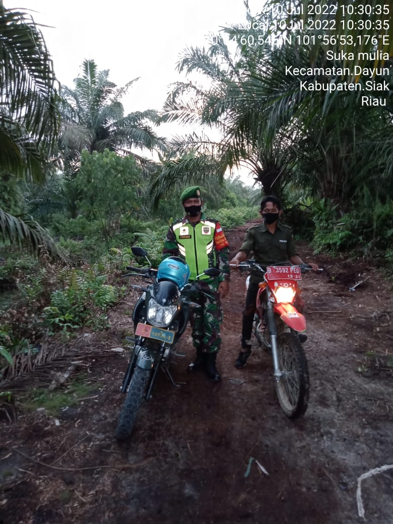 SIAK- Babinsa Koramil 01/Siak jajaran Kodim 0322/Siak Serda Ponidi bersama Manggala Agni melaksanakan kegiatan Patroli Karhutla di Kampung Suka Mulia Kecamatan Dayun Kabupten Siak. Kegiatan di Laksanakan pada, Minggu, 10 Juli 2022.