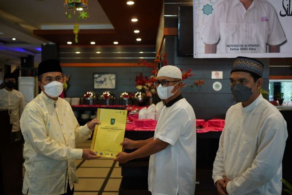 Dalam kegiatan Silaturrahmi ini, Gubri Syamsuar juga menyerahkan dana hibah kepada Pengurus Serikat Media Siber Indonesia (SMSI) Provinsi Riau.
