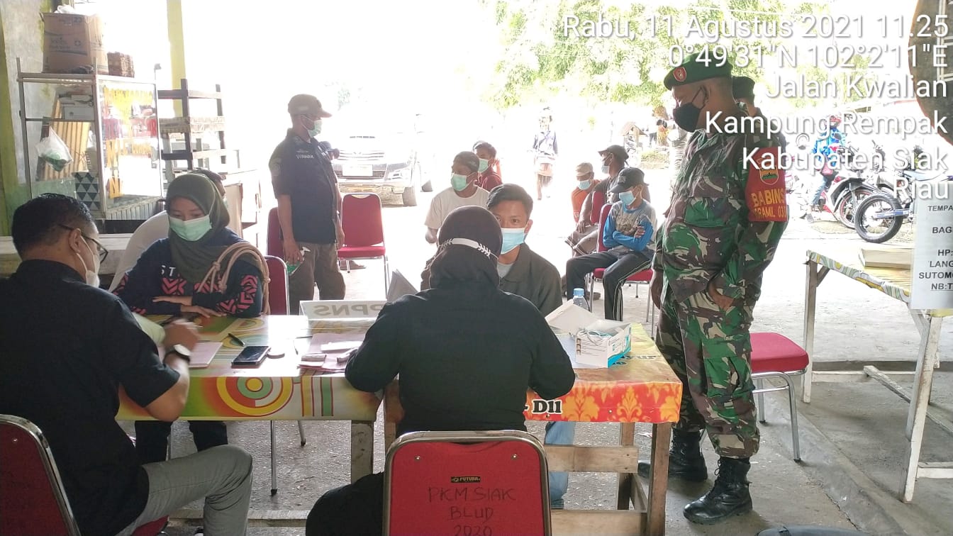 Siak Sri Indrapura – Aparat Gabungan dari Koramil 03/Siak Kodim 0303/Bengkalis bersama Polsek Siak, Dishub dan Satpol PP menggelar operasi Yustisi dimasa PPKM Level 4 Simpang 4 Kwalian jl. Hangtuah Kelurahan Kampung Tempat Kecamatan Siak Kabupaten Siak, Rabu (11/08/2021).