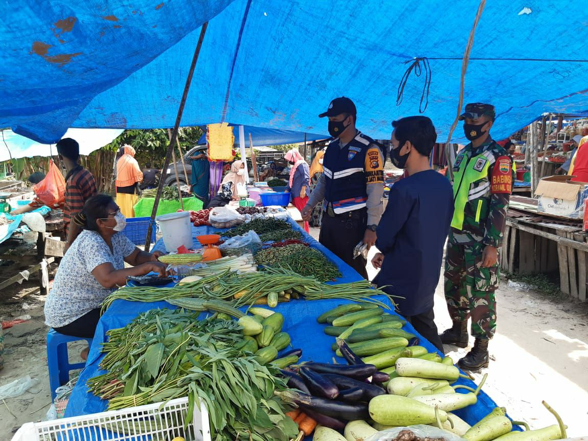 Pantau Pasar Tradisional, Babinsa Bersama Bhabinkamtibmas Imbau Pedagang Terapkan Protokes