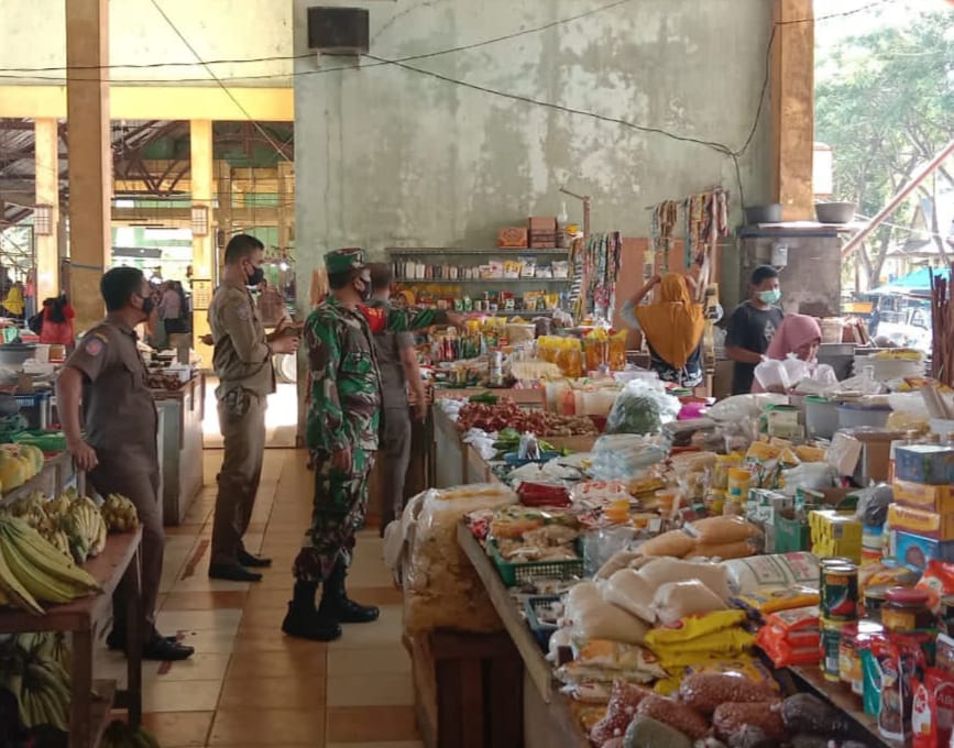 Siak Sri Indrapura – Babinsa Koramil 03/Siak Kodim 0303/Bengkalis bersama Satpol PP Kab. Siak melaksanakan penegakan disiplin Protokol Kesehatan (Prokes) di Pasar Tradisional Belantik Raya Kelurahan Kampung Dalam Kecamatan Siak Kabupaten Siak, Minggu (29/08/2021).