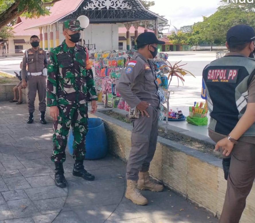 Siak Sri Indrapura – Aparat Koramil 03/Siak,Polsek Siak dan Satpol PP mengimbau pengunjung tempat wisata untuk mematuhi protokol kesehatan di Taman Mahratu Kelurahan Kampung Dalam Kecamatan Siak Kabupaten Siak, Minggu (19/09/2021).