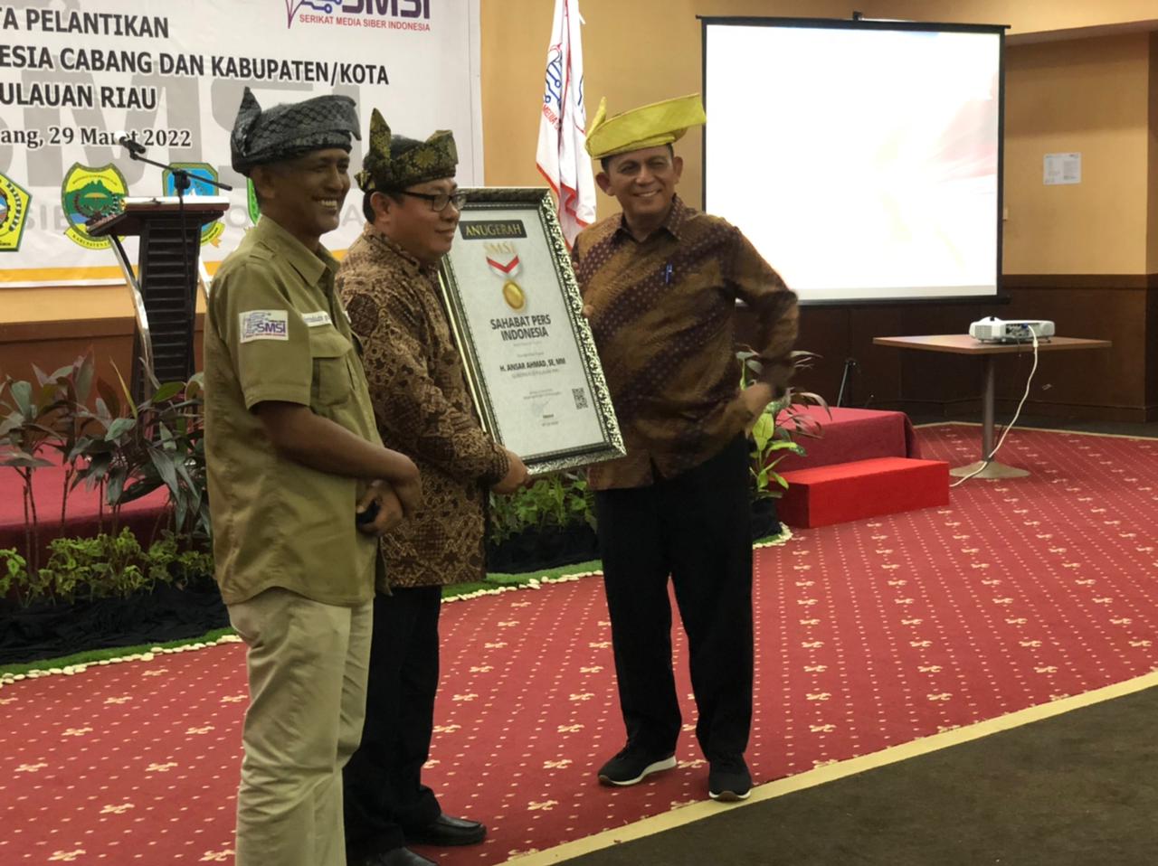 Ketum SMSI Firdaus melantik pengurus SMSI Kepri memberikan Anugrah Sahabat Pers Indonesia kepada Gubernur Kepri Ansar Ahmad sebagai gubernur yang peduli dengan pers.