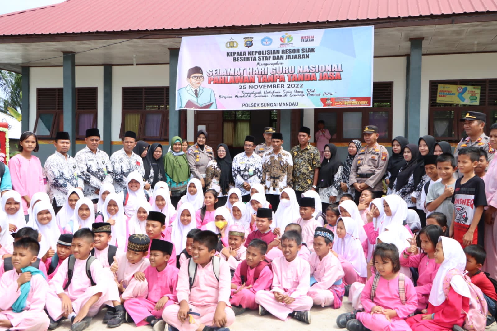 SIAK – Ikut memperingati Hari Guru Nasional, Kapolres Siak Polda Riau AKBP Ronald Sumaja diwakili Kabag Sumda Polres Siak Kompol Tapip Usman didampingi Kasat lantas Polres Siak AKP Viola Dwi Anggraini, Kasat Binmas Polres Siak AKP Yusirwan, dan Kasi Humas Polres Siak AKP Ubedillah, memberi kejutan untuk guru-guru di SD N 04 Olak Kecamatan Sungai Mandau Kabupaten Siak,Jumat 25 November 2022.
