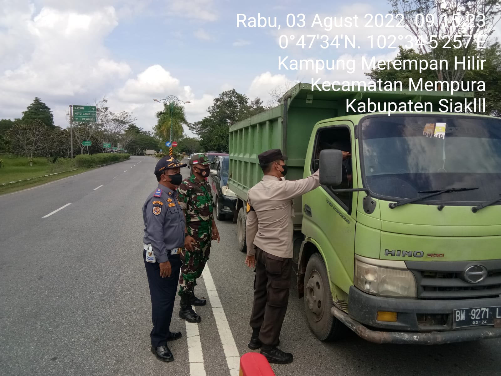 SIAK- Personel Kodim 0322/Siak, Babinsa Koramil 01/Siak bersama Personal Polres Siak, Dinas Perhubungan (Dishub) Siak dan Dinas Kesehatan melaksanakan himbauan Penegakan Protokol kesehatan sekaligus Vaksinasi Covid-19 bagi yang belum melaksanakan vaksin. Kegiatan ini bertempat di Pos Dishub Siak, tepatnya di Kawasan Tertib Lalulintas (KTL) Jembatan Tengku Agung Sulatan Latifah(TASL) Siak Sri Indrapura, Rabu, 3 Agustus 2022.