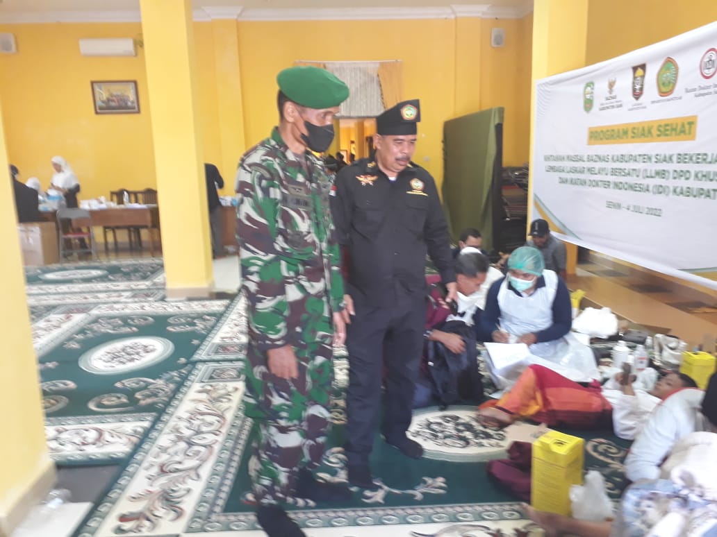 SIAK- Dandim 0322/Siak diwakili Kapten Inf H. Ginting menghadiri kegiatan Khitanan Massal Program Siak Sehat yang berkerja sama Pemda Siak dengan Baznas Kabupaten Siak LAM Siak, dan Ikatan Dokter Indonesia (IDI). kegitan ini di laksanakan di gedung Lembaga Adat Melayu(LAM) Kabupaten Siak. Senin 4 Juli 2022.