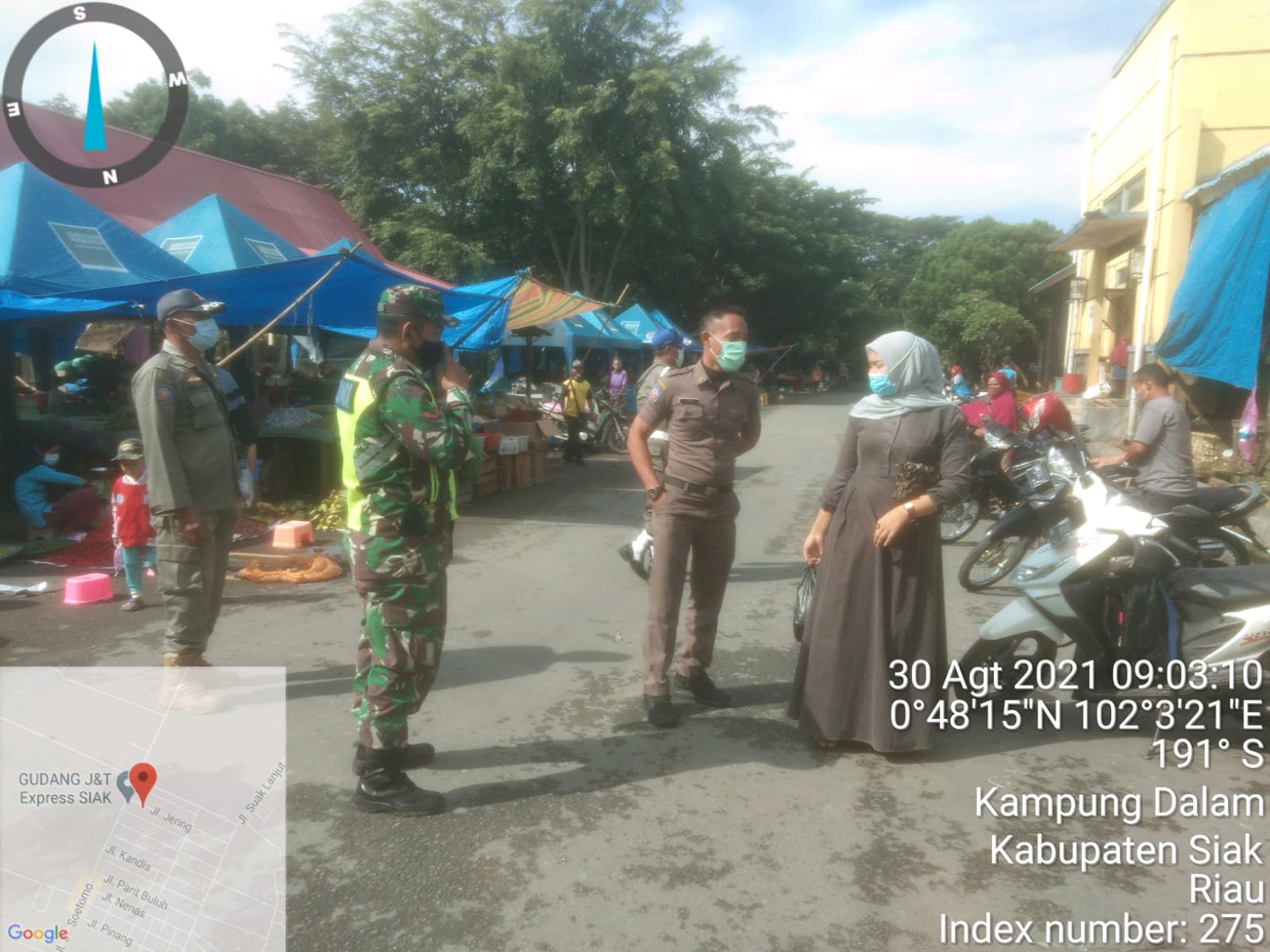 Siak Sri Indrapura – Personil Koramil 03/Siak Kodim 0303/Bengkalis Bersama Satuan Polisi Pamong Praja (Satpol PP) Kota Kab. Siak terus melakukan berbagai upaya untuk mengajak masyarakat agar disiplin mematuhi protokol kesehatan guna mencegah penyebaran Covid-19 di Pasar Tradisional Kelurahan Kampung Dalam Kecamatan Siak Kabupaten Siak, Senin (30/08/2021).
