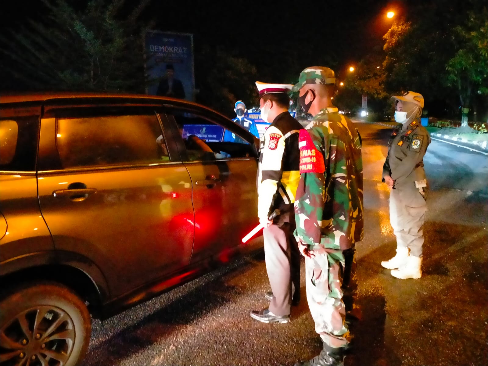 Siak Sri Indrapura – Petugas Gabungan melakukan penyekatan PPKM Level 4 di simpang empat bundaran Kwalian Kelurahan Kampung Rempak Kecamatan Siak Kabupaten Siak, Sabtu (14/08/2021) Malam.