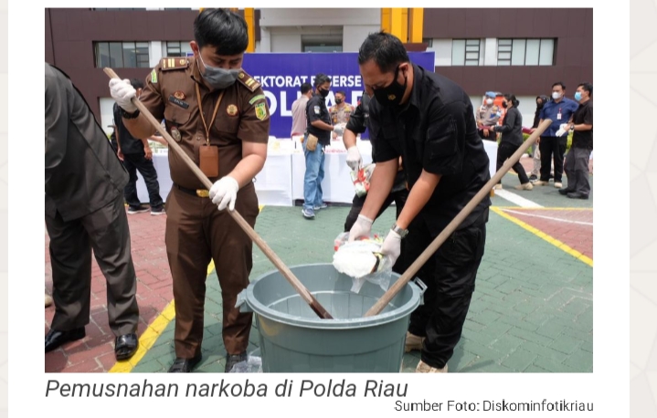 PEKANBARU – Kapolda Riau Irjen Agung Setia Imam Effendi bersama hakim Pengadilan Negeri Pekanbaru, Kejaksan Tinggi Riau, Kepala Laboratorium Forensik Polda menggelar acara pemusnahan barang bukti narkoba di Halaman Mapolda pada Selasa (4/5/2021).