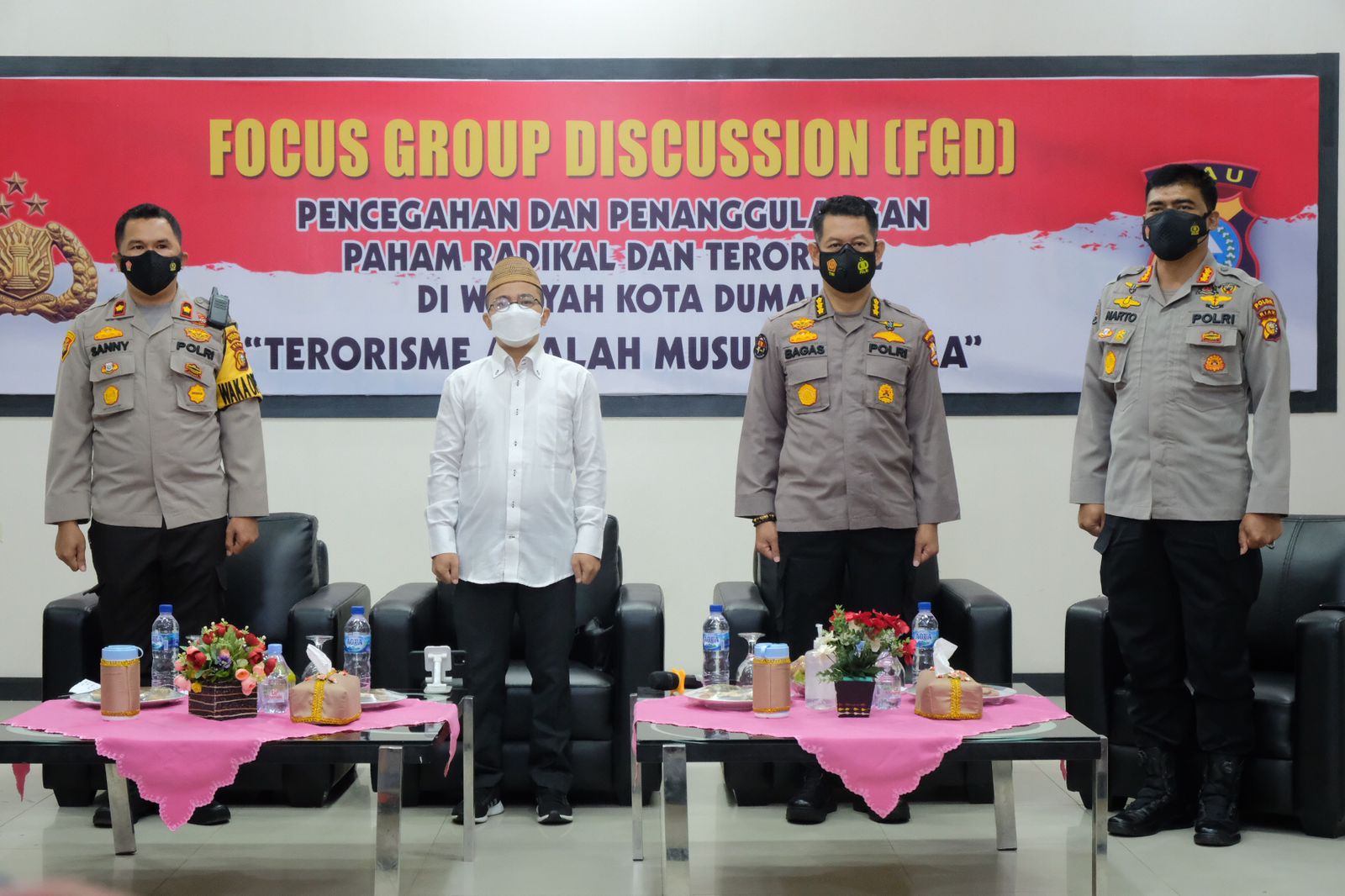 Hadir pada kegiatan tersebut Tim Divhumas Polri dipimpin Kabag Pemantauan dan Analisa Biro Multimedia Divhumas KBP Bagas Uji Nugroho S.I.K, Kabid Humas KBP Sunarto, Wakapolres Dumai KP Sany, Ketua NU Kota Dumai, KH. Anshori, Ketua Muhammadiyah Kota Dumai, Syawir Kasim, Ketua Persatuan Muballigh Dumai (PMD) Kota Dumai, H. Salamudin, Ketua HIMNI Kota Dumai, Fatizato Harefa, Wakil Ketua Ikatan Keluarga Jawa Sumatera (IKJS) Kota Dumai, H. Sugiman, Sekjen LAMR Kota Dumai, Jailani, Perwakilan Kerukunan Keluarga Sulawesi Selatan (KKSS) Kota Dumai, Abdul Rahim, Perwakilan IKMBD, Erwin Siahaan, Perwakilan IBKGD, Luhut Harianja, Perwakilan FKUB Kota Dumai, Zulkifli Hasibuan, KNPI Kota Dumai, Bahtra, hadir pula mantan napiter A’an Sentosa dan Rangga Respati.