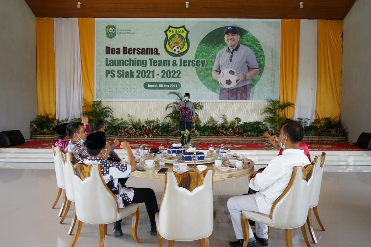 SIAK- Persatuan Sepak Bola Seluruh Indonesia (PSSI) Kabupaten Siak, menggelar Doa Bersama, sekaligus Launching Team dan Jersey Persatuan Sepak Bola Siak (PS Siak) 2021 – 2022, bertempat di Balairung Datuk Empat Suku Komplek Perumahan Abdi Praja, Jumat (5/11/21).
